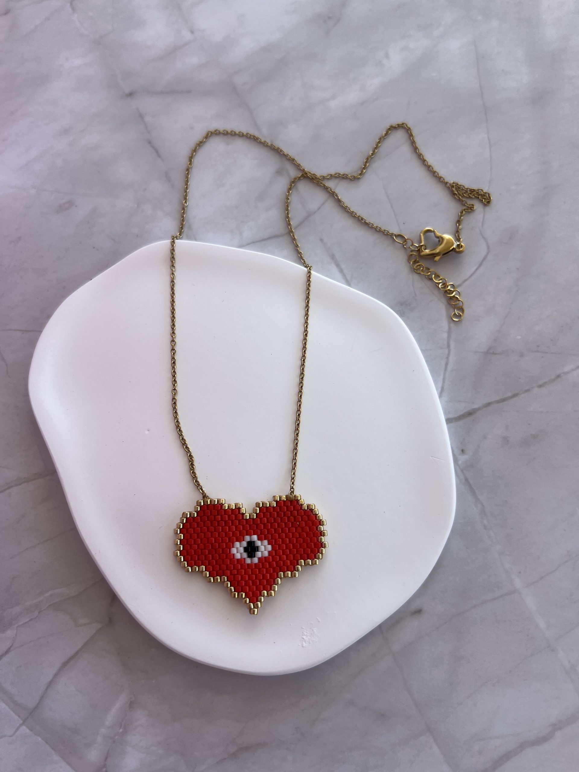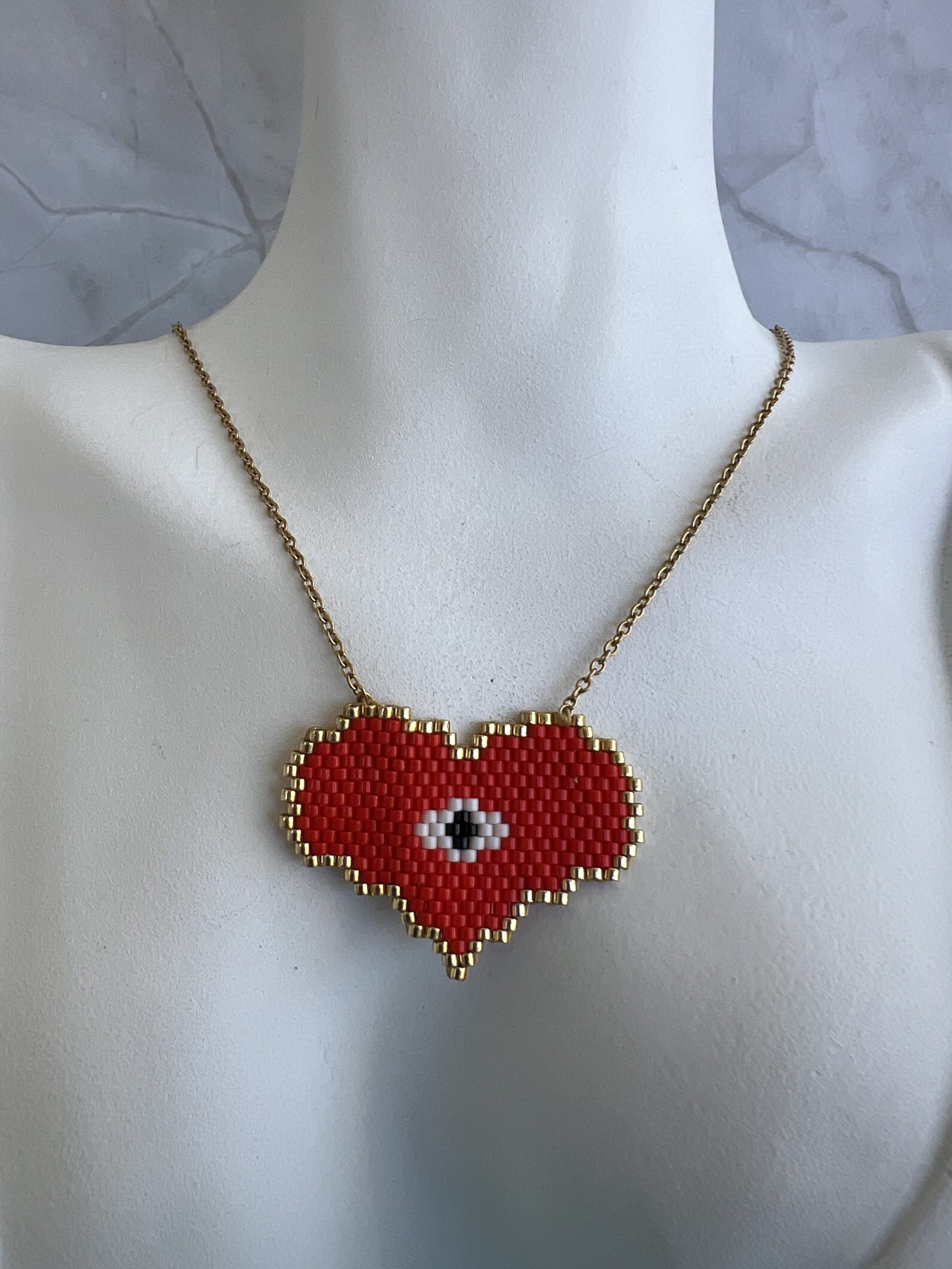 Κολιέ καρδιά και μάτι με χρυσή αλυσίδα κεντημένο με χάντρες Miyuki