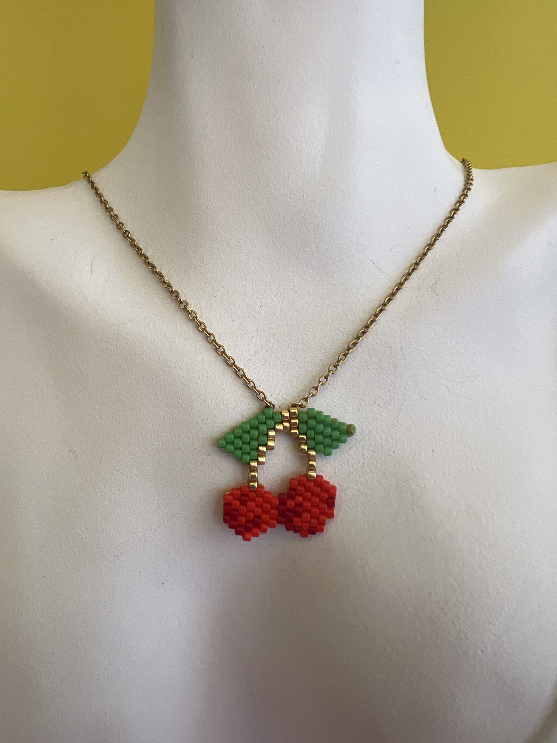 Κολιέ κεράσια κεντημένο με χάντρες Miyuki και χρυσή αλυσίδα